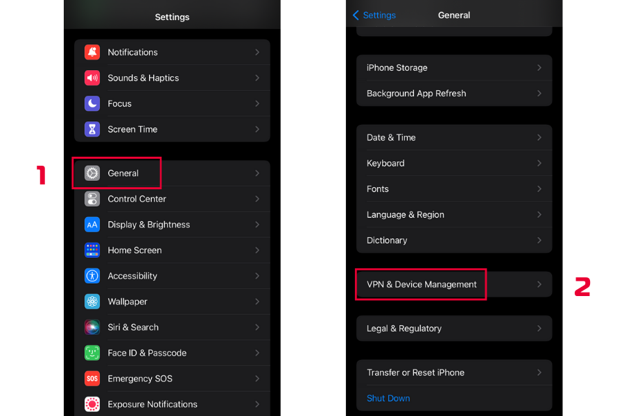 Bước 1: Cài đặt (Settings) > Cài đặt chung (General) > Chọn Quản lý VPN & Thiết bị (VPN & Device Management)