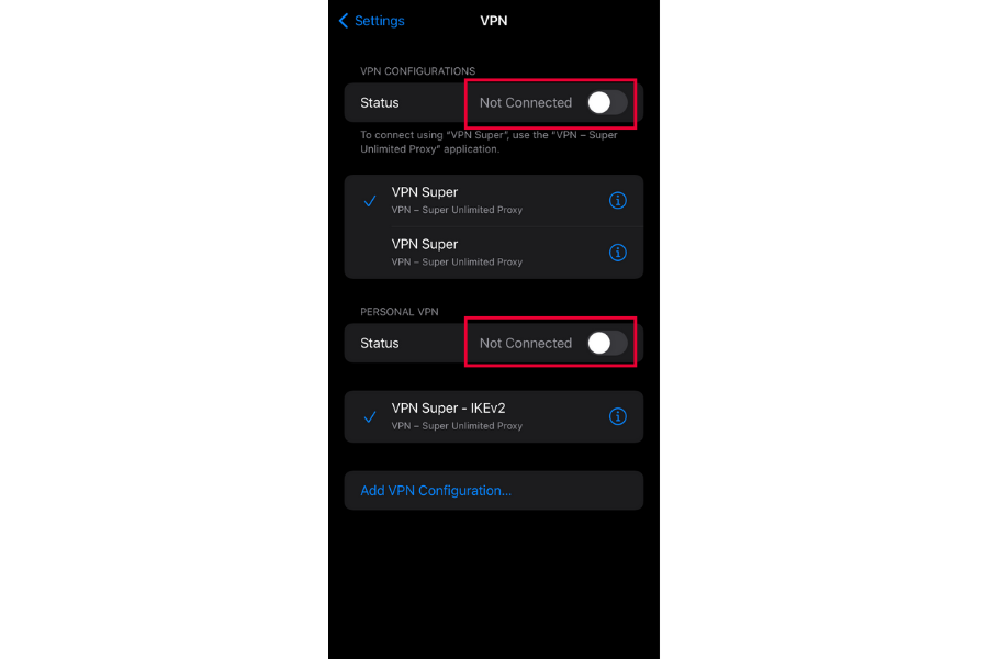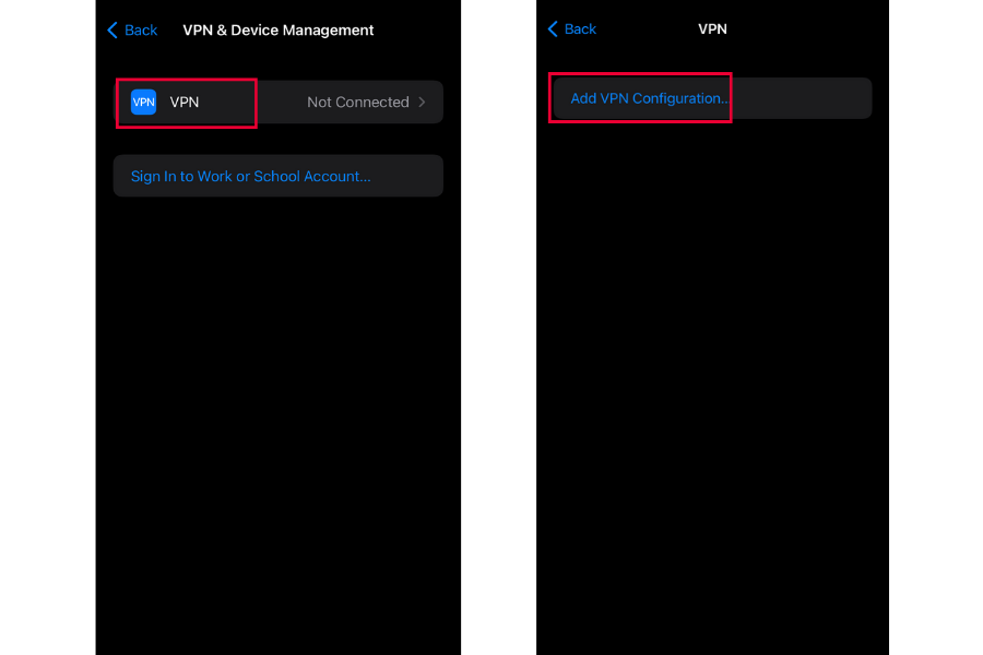 Bước 2: Chọn VPN > Thêm cấu hình VPN (Add VPN Configuration)