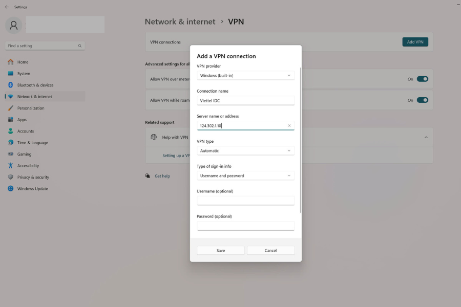 Bước 4: Điền các thông số cần thiết (tên VPN, địa chỉ IP). Trong đó, phần VPN Provider hãy chọn Windows (built-in) > Save.