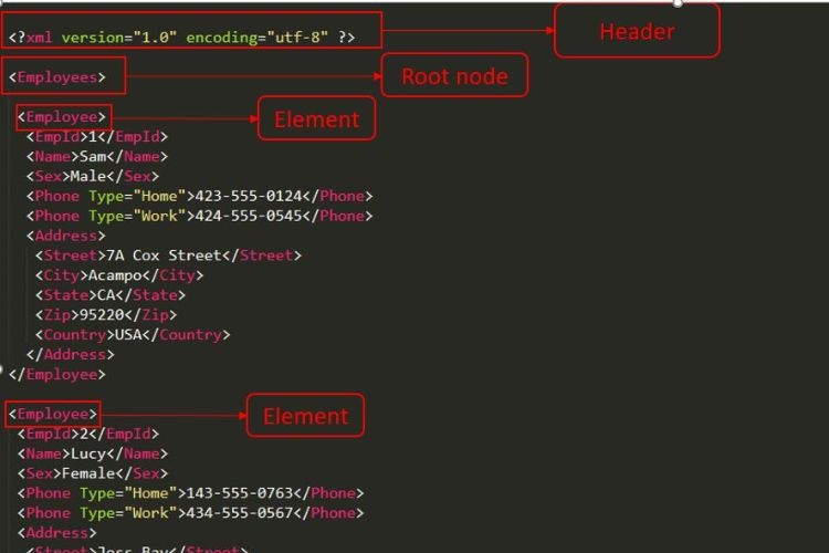 – Một file XML điển hình bắt đầu bằng phần khai báo <?xml version=”1.0″ encoding=”UTF-8″?>, giúp xác định phiên bản cũng như kiểu mã hoá của file. Phần tử chính sẽ chứa tất cả các phần tử con khác hoặc dữ liệu của nó.