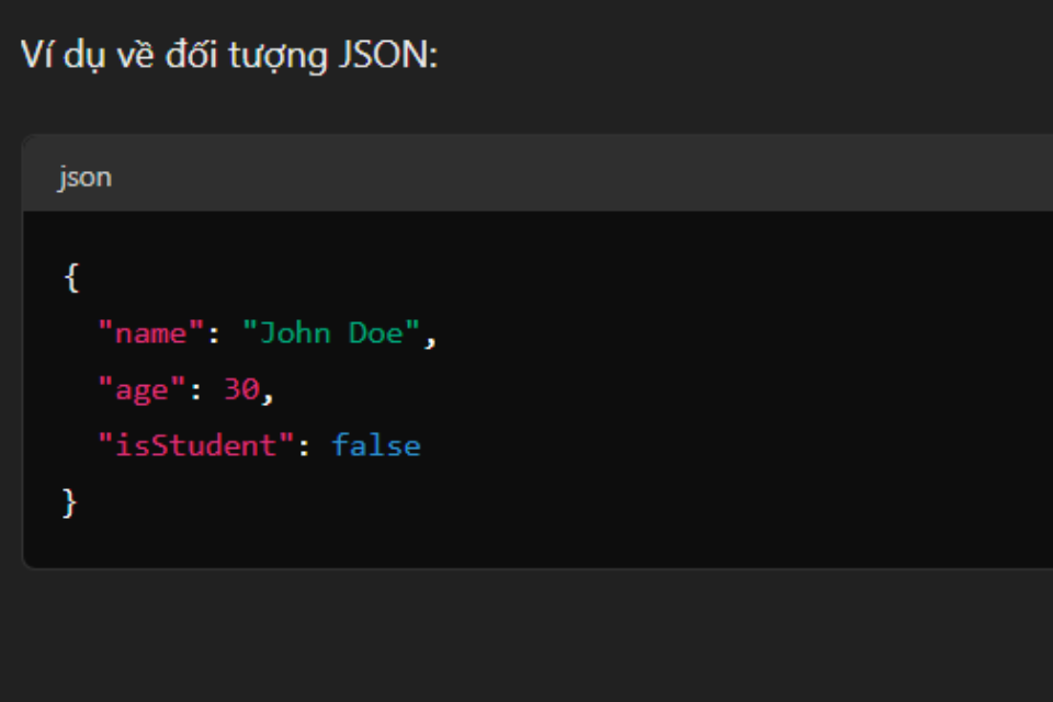 Trong JSON, đối tượng là tập hợp của nhiều cặp khóa-giá trị, được bao quanh bởi dấu ngoặc nhọn. Bạn có thể tưởng tượng một đối tượng như một bản ghi dữ liệu, ví dụ thông tin của một nhân viên gồm tên, tuổi và chức vụ. Các đối tượng có thể được lồng vào nhau để biểu diễn dữ liệu phức tạp hơn, chẳng hạn một nhân viên có thể chứa thêm thông tin về phòng ban hoặc địa chỉ liên hệ.