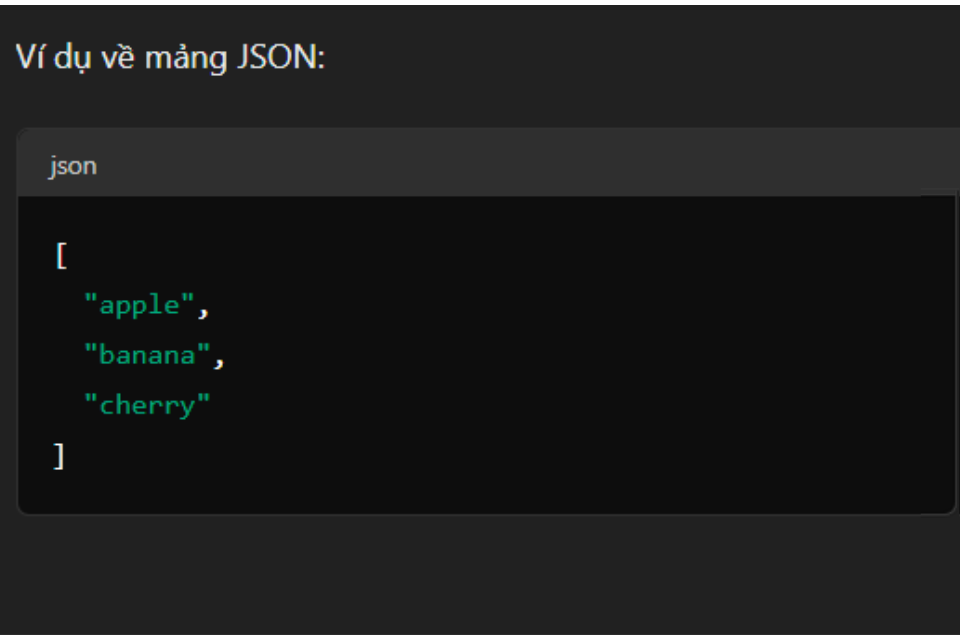 Mảng trong JSON được dùng để lưu trữ nhiều giá trị cùng loại, chẳng hạn danh sách tên người dùng, danh sách sản phẩm hoặc địa chỉ email. Các phần tử trong mảng được ngăn cách bằng dấu phẩy và đặt trong dấu ngoặc vuông. Mảng giúp tổ chức dữ liệu có tính lặp lại một cách gọn gàng, dễ xử lý và dễ truy cập.